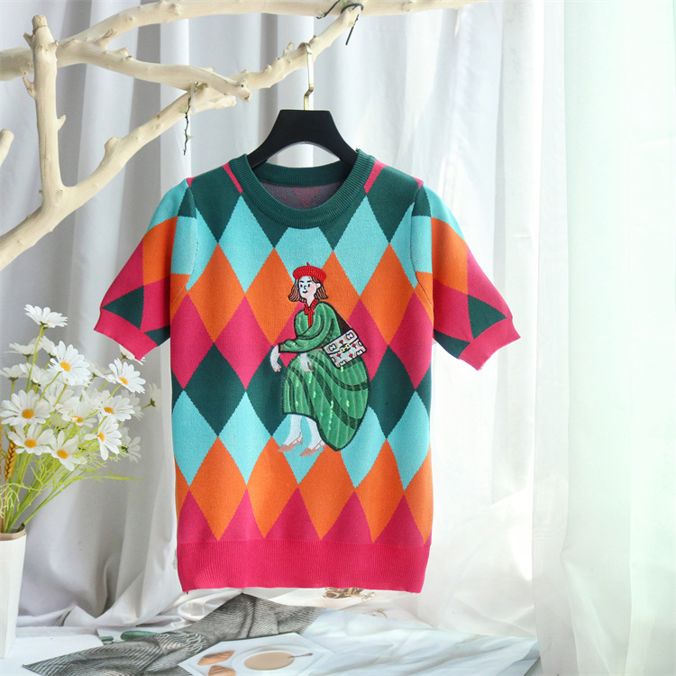 Summer Argyle Sequines Knitted T Shirt Women Fashion Casual Cartoon O-Neck Short Sleeve Sweater Pullover Ladies Tops Tees