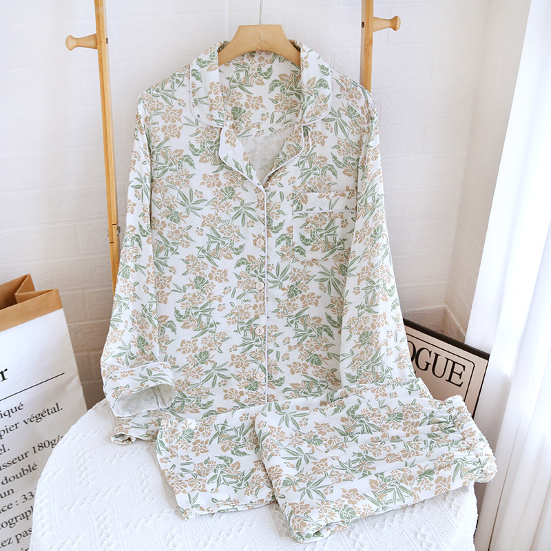 Summer Bamboo Fiber Lapel Long Sleeved Pajama Set Womens Loose Comfortable Two-piece Pijamas Breathable Home Clothing