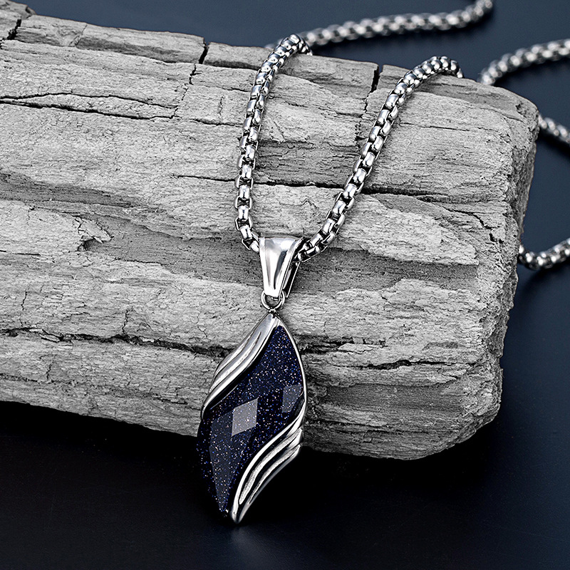 Stainless steel blue sandstone black agate angel eye pendant blue sandstone leaf versatile necklace for trendy men