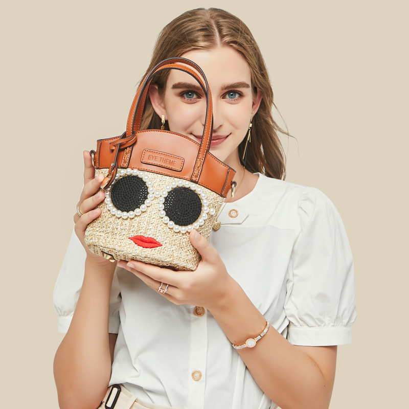 Trendy and personalized straw woven rhinestone contrasting water bucket hand-held diagonal cross bag Japanese and Korean style versatile women