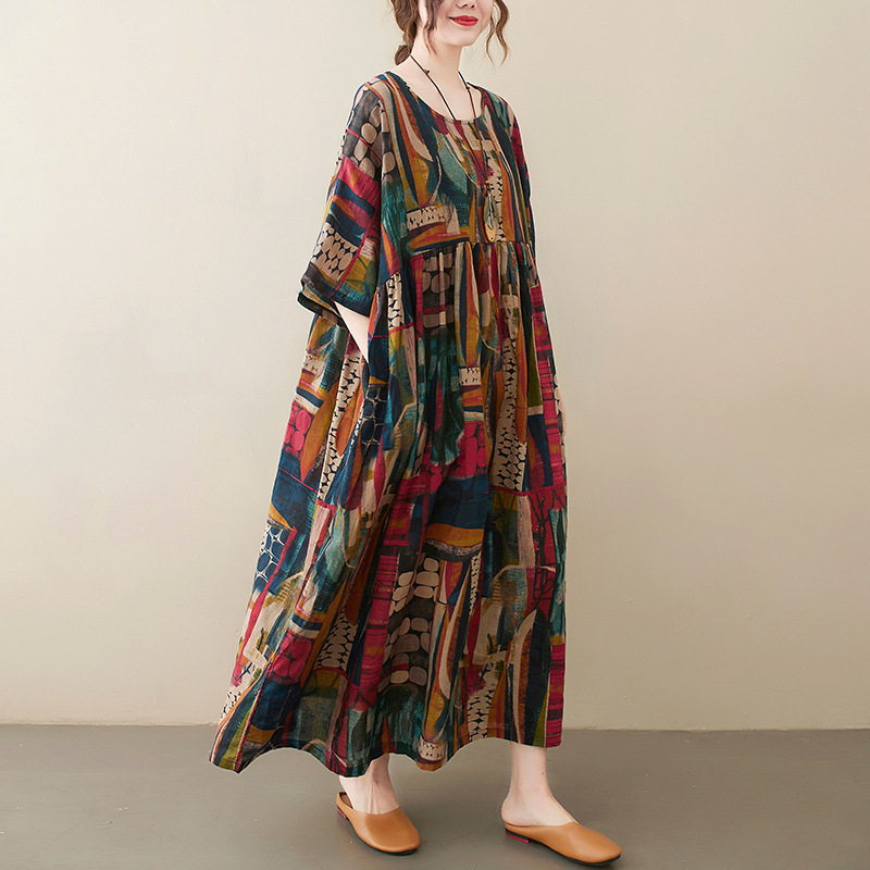 Short Sleeve Cotton Linen Vintage Print Summer Long Dresses For Women 2024 Casual Loose Holiday Ladies Dress Elegant Clothes